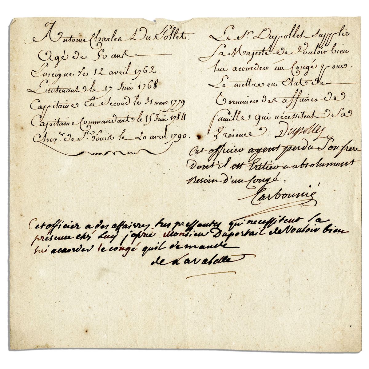Earl de la Valette autograph note signed. The Earl, also known as General Louis Jean-Baptiste Thomas, served in both the French and American Revolutionary Wars. Here he handwrites the lowermost section of a note requesting that Capt. Antoine Charles Du Sollet be dismissed on leave to attend to family affairs following the death of his brother: ''...kindly grant him leave as requested. [signed] de La Valette''. Two other officers sign the document on the soldier's behalf. 1pp. measures 8'' x 7.5''. Light foxing, creasing and two small tears to the top edge. Very good condition.