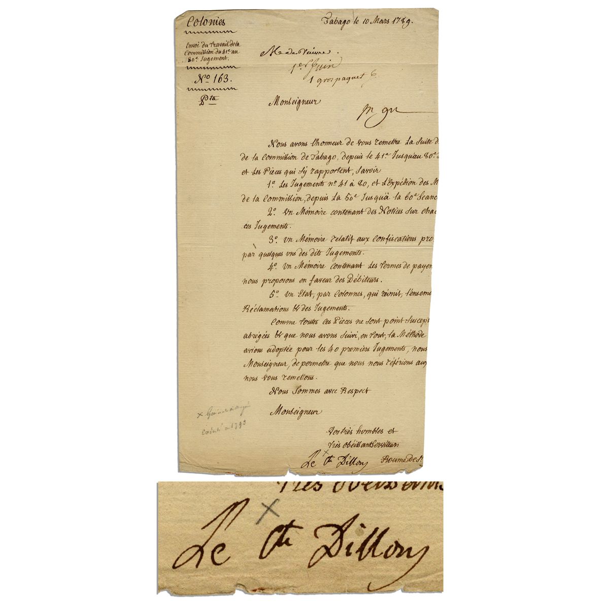 Irish born French patriot and General in the American Revolutionary War, Arthur Dillon document signed, dated 10 March 1789. Signed ''A Dillion'' as Governor of Tobago, with ''Colonies'' written at upper left. A reform Royalist, Dillon sought to align the nobility and the French people but was nevertheless killed in the Reign of Terror. 7'' x 12.75'' document lists various memorandums regarding legal judgments and debts. Right side is trimmed with minor loss of content. Expected toning and minor chipping, overall in very good condition.