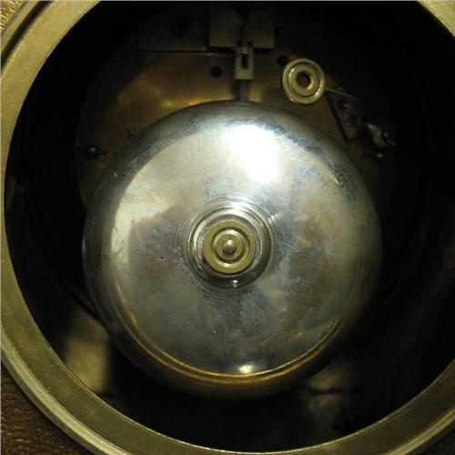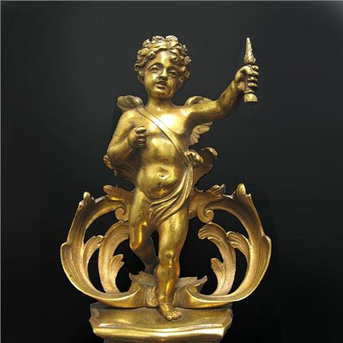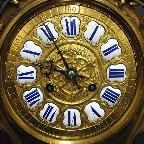 French Rococco Revival bronze clock; topped with cupid holding a torch; side and front panels of pierced pattern backed by crimson silk; stands on an open platform with scroll feet; dial with engraved gilt bronze and white porcelain tablets with cobalt Roman numerals; strikes at hour and half hour; 19th C.; working order; 22" high x 11" across x 6" deep; no visible defects