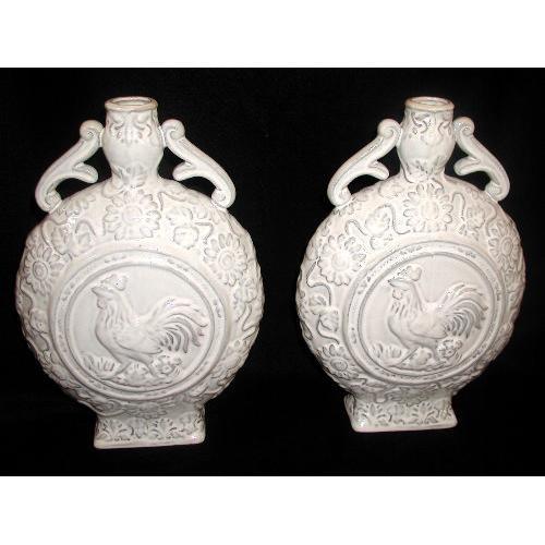 Pair of double handled ceramic vintage French rooster vases have an off white background and grey blue outlining. Same design front and back with center rooster,floral and leaf surrounding motif. Both in excellent condition,no nicks,chips or cracks. Measure 14H X 9L X 4D.
