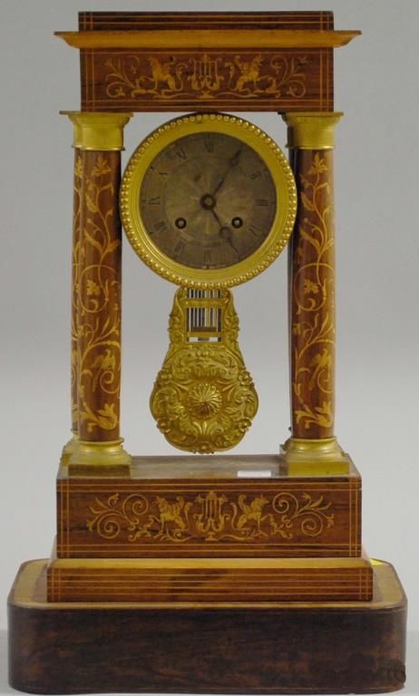 French Rosewood Portico Clock, c. 1900, string- and marquetry-inlaid case and pedestal, cast brass engine-turned capitals, silvered ...