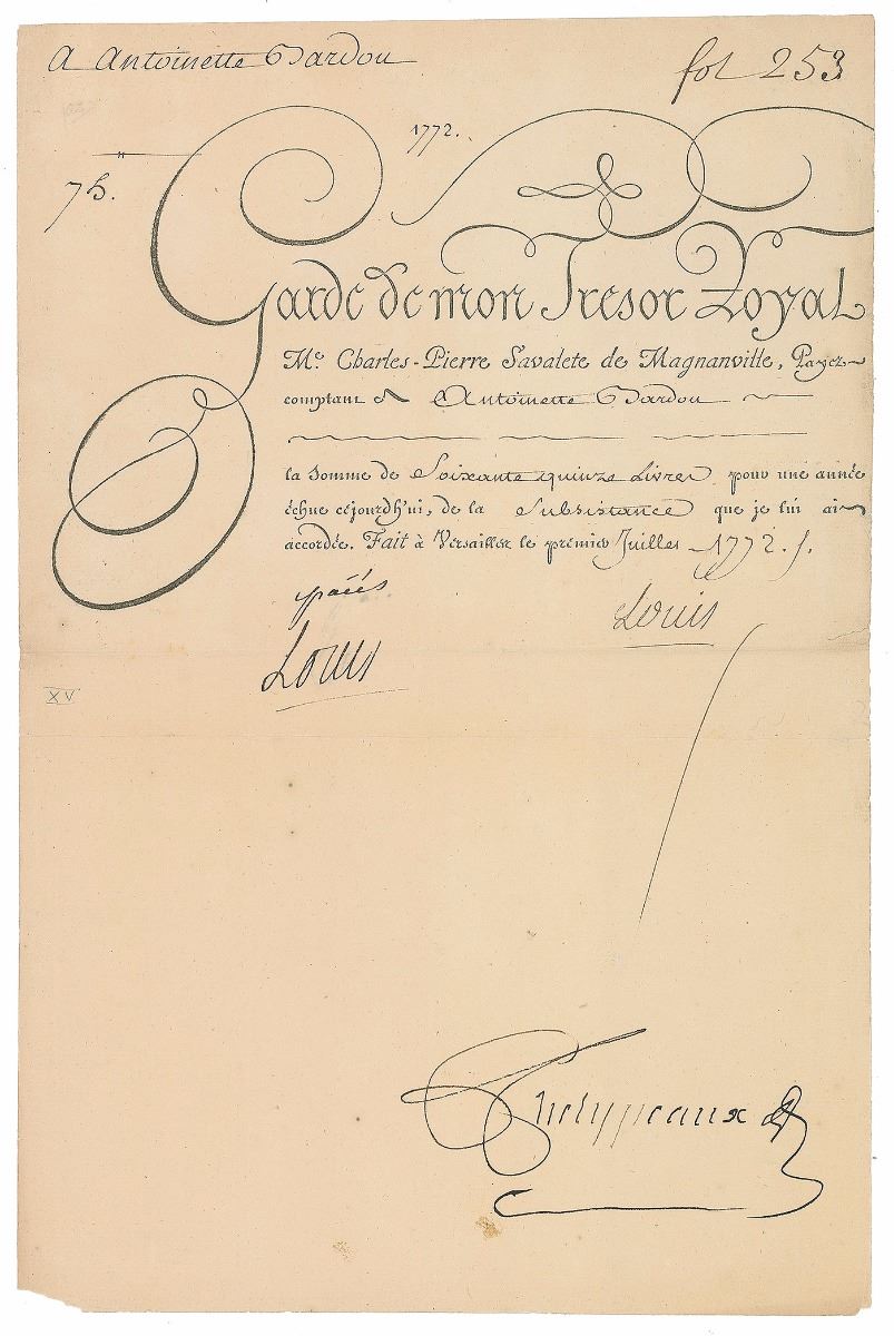 Two items: a partly-printed document endorsed by King Louis XV, “Pay, Louis,” one page, 9.5 x 14.25, July 1, 1772, ordering the royal treasurer to pay a pension of 75 livres to Antoinette Bardou; and an LS signed by nobleman Louis Marie de Narbonne as minister of war, “L. de Narbonne,” one page both sides, 8 x 12.5, January 22, 1792, concerning three naval officers who have applied for pensions. In overall fine condition. The King Louis XV document also bears a secretarial signature of the king.