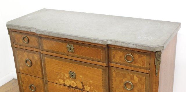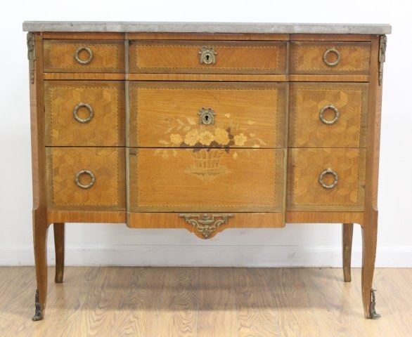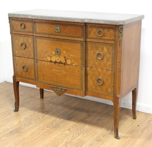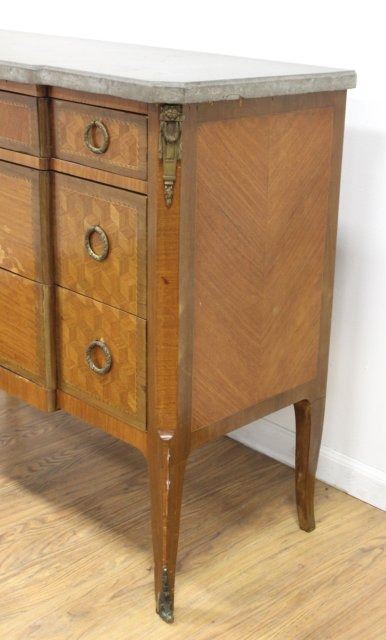 Grey marble top. 3 drawer. Bronze mounted. Circa 1910-20s. Approx. 36 1/2" H x 43 1/4" W x 18" D. (6091) Flakes on edge of marble in back.