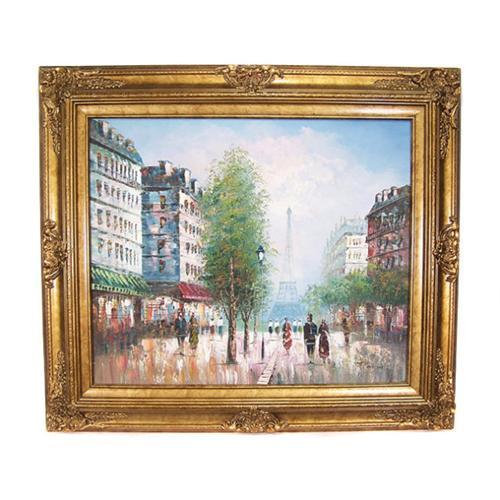 Here we have an exquisite painting by who we believe to be T. Carson, however we cannot tell for certain because it is near illegible. Painted with oil on canvas, this painting depicts a scene in Paris with the Eiffel Tower in the background. Full of great detail, it really brings the place to life. It's gorgeous frame compliments the painting wonderfully. This fantastic item would look great on your wall, make sure to check out all the pictures to see it for yourself!