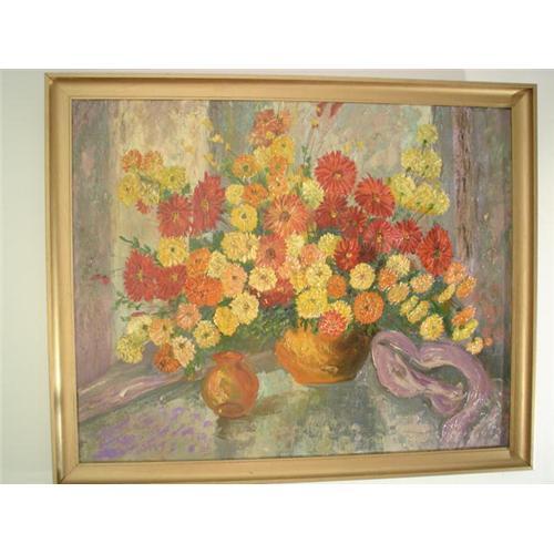 French School 20th. C. A very colorful floral still life. Oil on canvas. Excellent condition & measures 24"x30". Painting will brighten any room in your house.