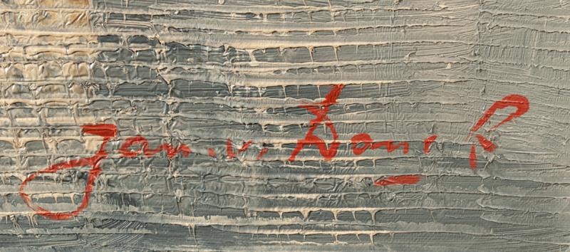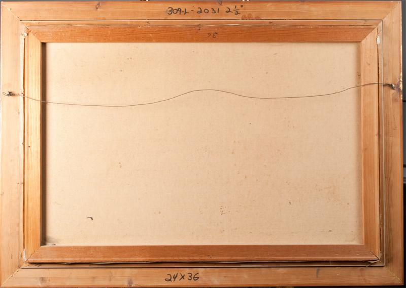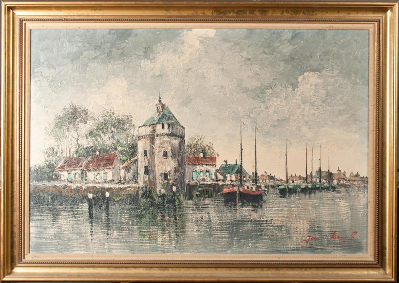 Painted to depict a harbor scene with boats and buildings, in a heavy pallet style, signed LL Jamie ???. Mounted in a carved openwork frame, 24" H x 36" W (sight). Circa 1950's.