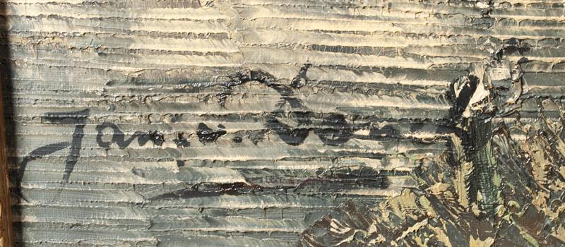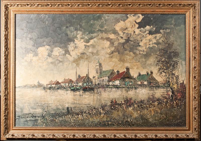 Painted to depict a harbor scene with boats and buildings, in a heavy pallet style, signed LR illegibly, mounted in a carved giltwood frame. 24" H x 36" W (sight). Circa 1950.
