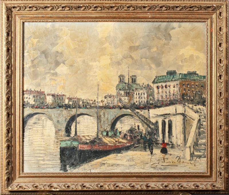 Painted to depict a river scene with tunnel bridge and buildings, done in a pallet knife style, signed LR illegibly,mounted in a carved wood frame. 20.5" H x 24" W (sight), circa 1950.