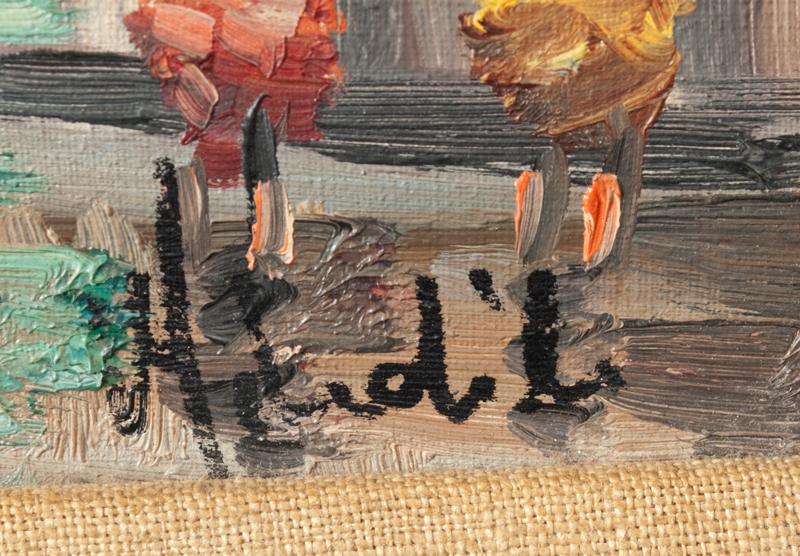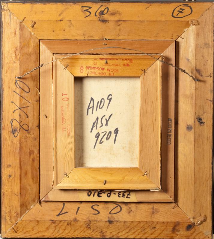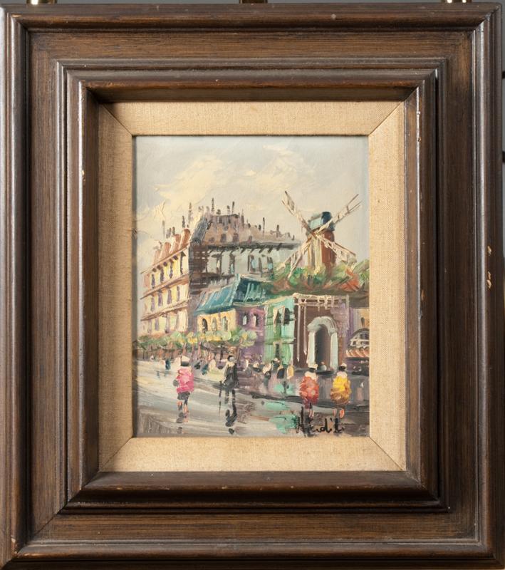 Painted to depict a French street scene with buildings, windmill and figures. Signed LR illegibly, with stamped on stretcher for Windsor Wood Chicago, IL. 10" H x 8" W (sight). Circa 1950's-1960's.