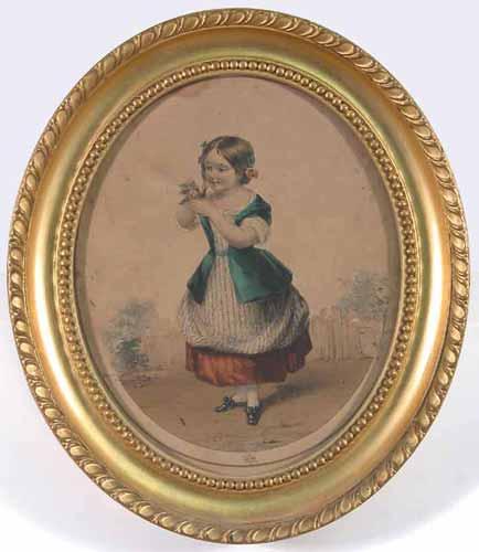 French School coloured lithograph, Girl with a songbird, Oval, 8 x 6 ins. £30-50