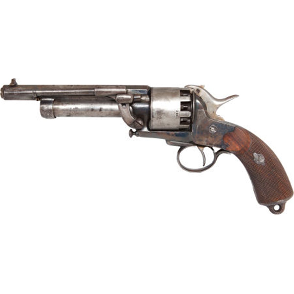 French Second Model LeMat Percussion Revolver. Serial no. 1386, .42/.63 caliber, 6 3/4-inch octagonal .42 caliber barrel, the top flat marked: Col. Le Mat Bte s g d g Paris. .63 caliber barrel beneath. Hammer with barrel selective switch. Loading lever on left side of barrel. Blued finish. Checkered walnut grips. Lanyard loop. Condition: Very good. Retaining approximately 15-20% finish, the remainder showing scattered spotting and light pitting with grey patina present. Grips with light wear and minor bruises. Action tight and crisp.