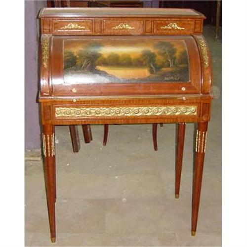 French classic desk featured in Marquetry Inlay finish with decoratively legs for an elegant look. A pull-out writing board, storage drawers can be discretely hidden with the roll top.
