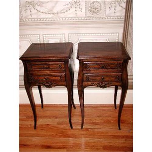 Pair of walnut C.1870-75 side tables,night stands or night tables have pot bellied sides which adds to their unique shape.Hand made with tiny chisel marks here and there,rich hand rubbed finish. Beautiful oyster carving on front as well as richly aged wood throughout. Drawers are lined on all four sides with sage green and pink floral fabric,not paper. Stand on tall delicate legs. Finished on the back for use out in a room. Excellent condition. Measure 27.5H X. 13.5D X 14.5L.