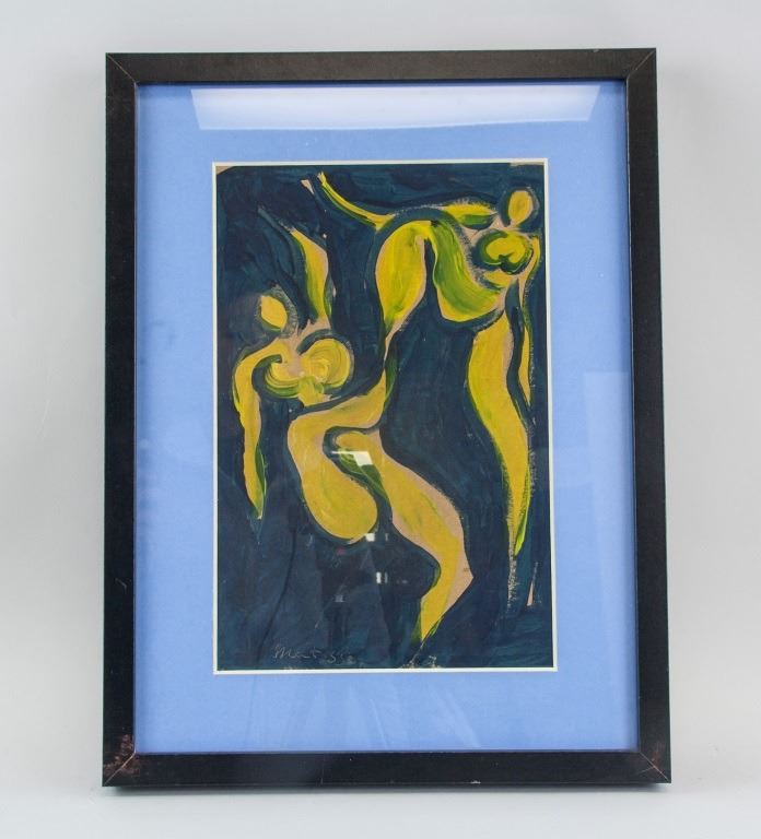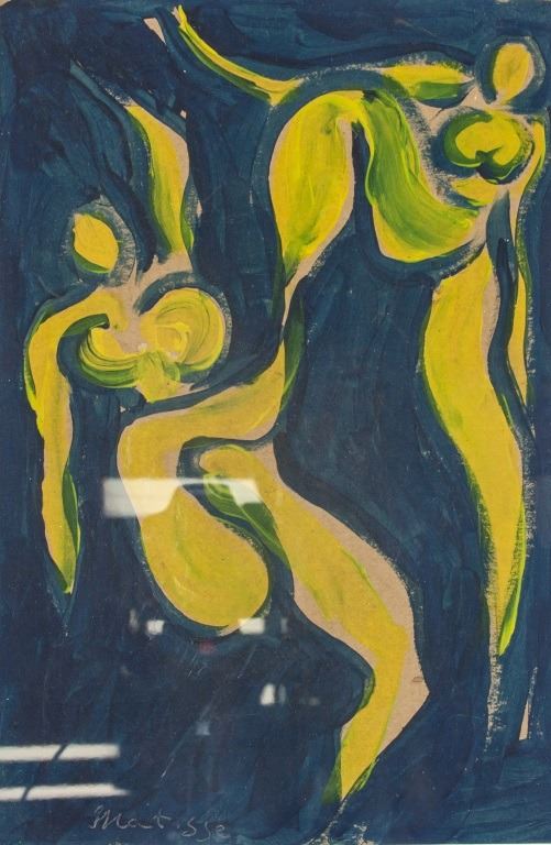Oil on board painting, featuring two abstract figures. Signed and attributed to Henri Matisse (French 1869-1954) on lower left corner. 11 3/4 x 7 3/4 inch (29.85 x 19.69 cm). Henri Matisse was a leading figure of Fauvism and, along with Pablo Picasso, one of the most influential artists of the modern era. In his paintings, sculptures, and works on paper, Matisse experimented with vivid colors, Pointillist techniques, and reduced, flat shapes. “What I dream of is an art of balance, of purity and serenity, devoid of troubling or depressing subject matter,” he once said; his subjects of choice included nudes, dancers, still lifes, and interior scenes. Matisse’s animated brushwork and seemingly arbitrary application of bright colors, as in Woman with a Hat (1905), would prove foundational to Fauvism, while his similarly radical The Red Studio (1911) was a seminal, nearly monochromatic study in perspective. Later in life, physically debilitated, Matisse would turn to making bold, cut-paper collages. He has influenced a wide range of important 20th-century painters, from Hans Hofmann and Milton Avery to Tom Wesselmann and David Hockney. PROVENANCE: Southern Ontario Estate