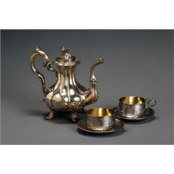 French Silver Coffeepot and a Pair of Cups and Saucers