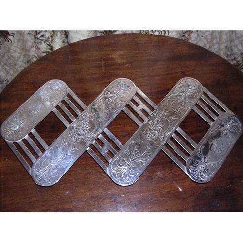 French silver plated hot food expandable trivet. The trivet expands to be 26.25" in length and 6.75" in width. The trivet is marked Drevete S.G.D.G.