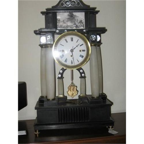 French spring driven regulator mantle clock with 6 marble columns, mother of pearl applique, re-creation of a ca. 1920 style by Reinhard Beil (1923-2006)