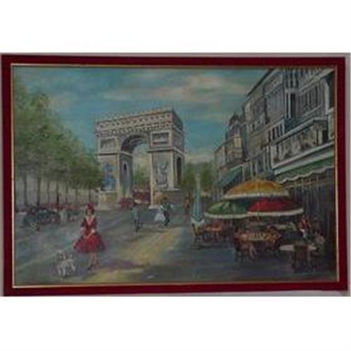 A large oil painting on artist board, 26" X 38". A Paris scene painted by an art student or a great unknown painter, you decide. A great campy piece of art. Signed Grace Neill 66