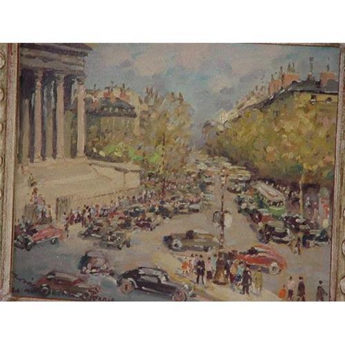A small framed oil painting on canvas, 14 1/4" X 12 1/2", the canvas is 8" X 10". An impressionist view of a busy Paris street of the late 1940's or 1950's, signed in the lower left but I really can't read it. It is a tiny painting with a lot to look at.