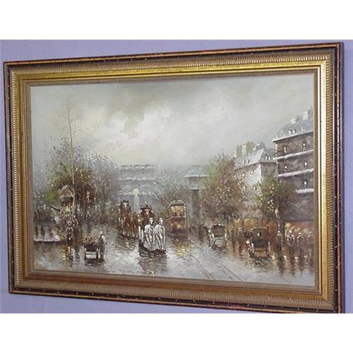 A large oil painting, 42" X 29", framed size. Painted on artist board the scene depicts a busy Parisian street with horse drawn carriages, street vendors and pedestrians. The painting is signed in the lower right "J.Gaston". Nicely framed and in very nice condition. (11)