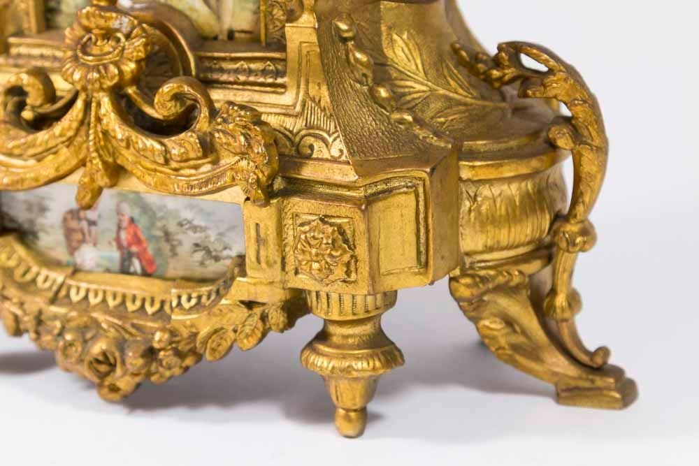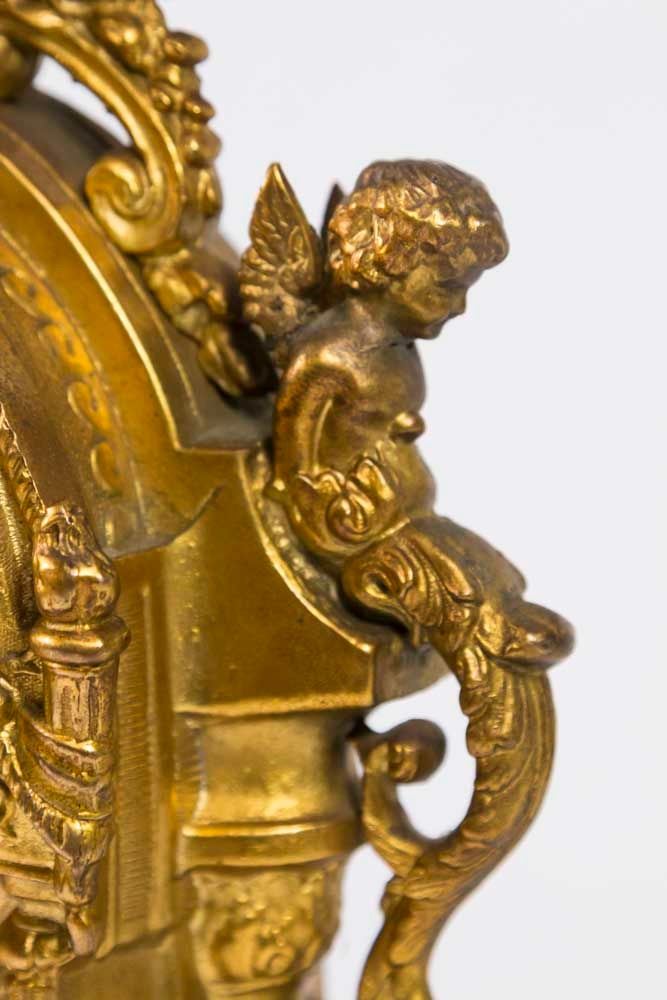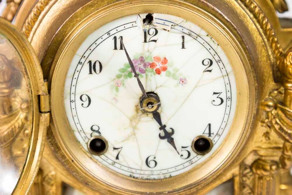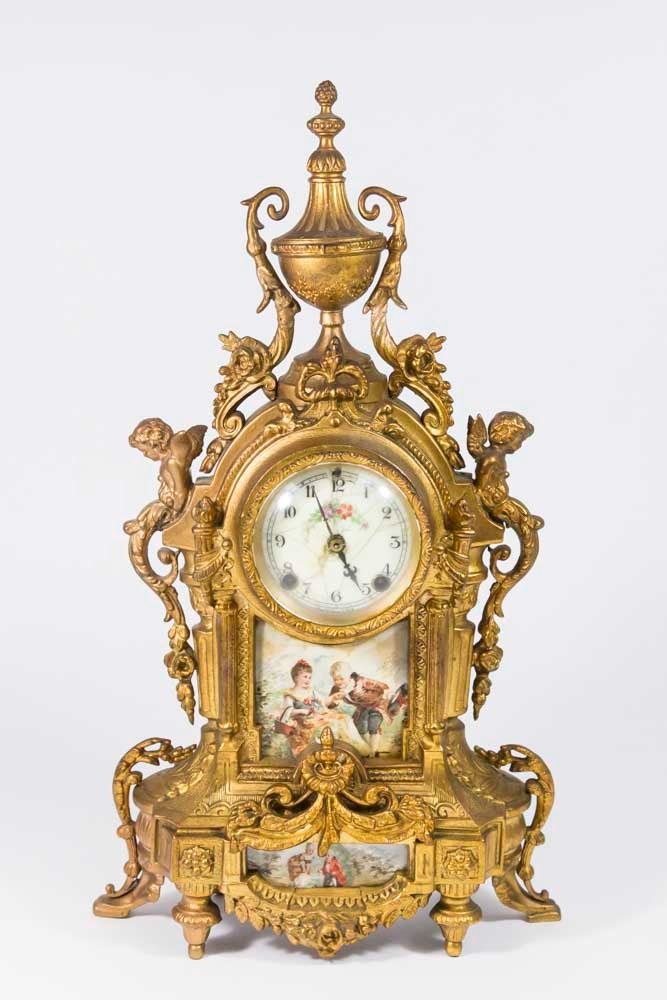 With porcelain plaques and cherub. Face approx. 18 1/2" H. (6055) Some restorations and cracks on dial.