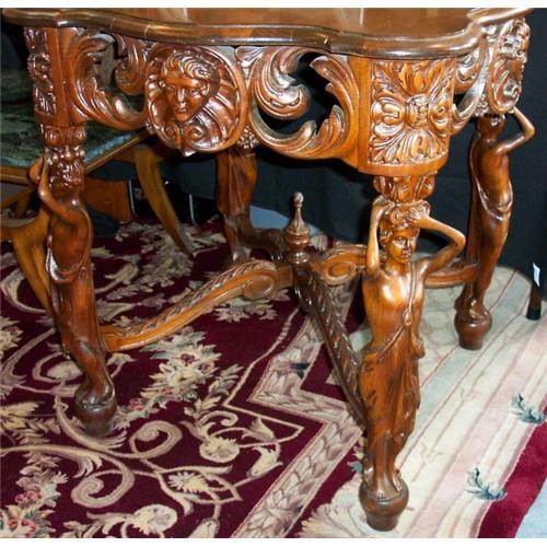 Antique French center hall table with one full female figure on each leg. Faces and carvings on each apron side. Carved bottom bridgework with center finial. Excellent condition. This is a one of a kind piece for your home or office.