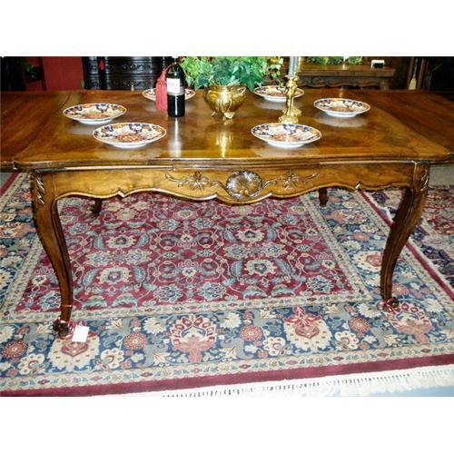 This beautiful Louis XV style dining table is made of walnut. The top of the table is parquet and boasts a carved apron and carved legs. The traditional French cabriole leg and escargot feet are used. The table measures 5 feet wide, about 3 1/3 feet deep and is 29" tall. When the leaves are drawn, the length of the table expands to over 8 feet long. This table has been varnished and has a fairly glossy top. Should you need a shipping quote, please e-mail me your zip code and I will give you an estimate. Thank you for viewing!