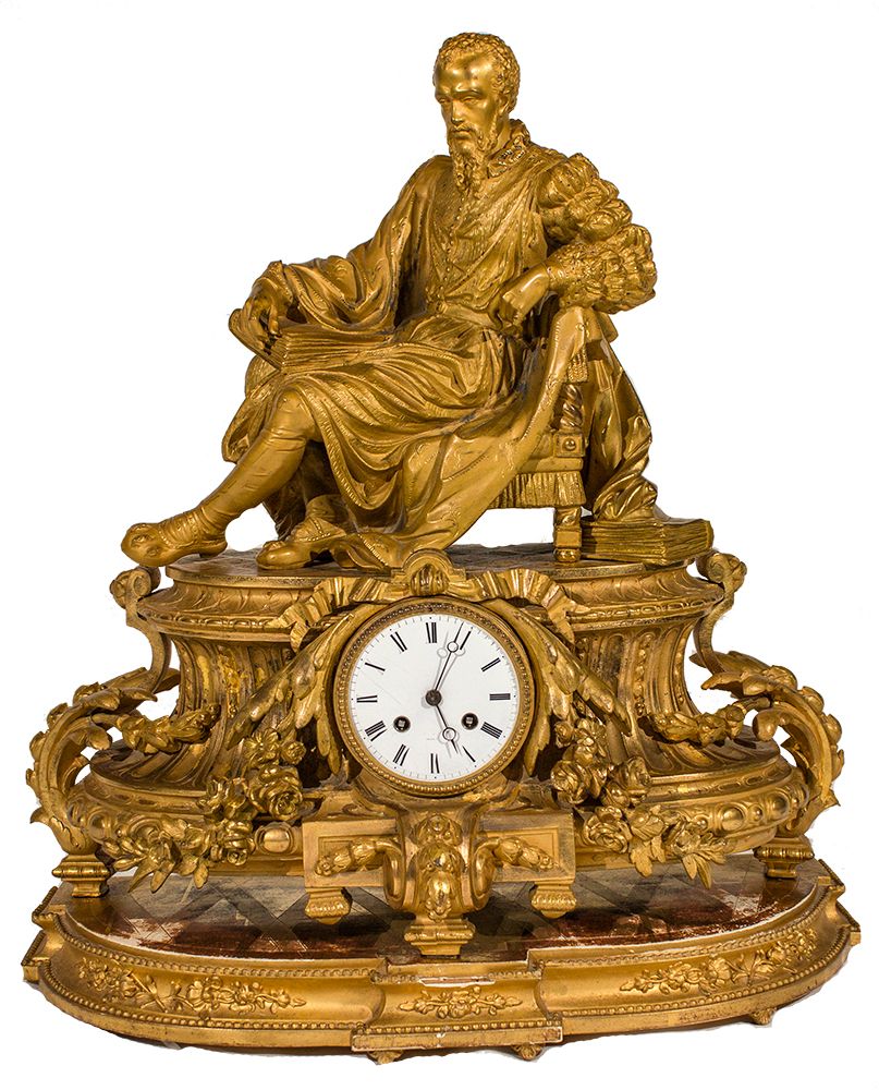 c1875 Large and very ornate French table clock with an Elizabethan scholar sitting atop the clock. The ormolu case is 20" high, 20" wide and about 7.5" in depth on a surrounding pedestal. The foundry mark is P.H. Mourey. The winding clock is an 8-day time and strike on bell movement by Marti. The clock features a new pendulum, and rebuilt works in 1907. P.H. Mourey was a master French sculptor, & was known for his work with Japy Freres & Co. the noted 19th century Paris clock maker. Fairbanks Collection - HKA#66037