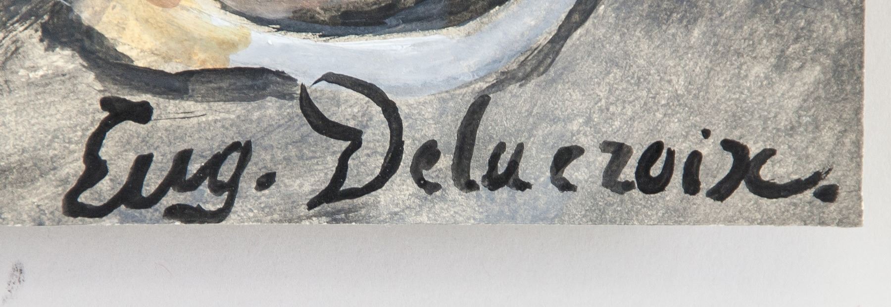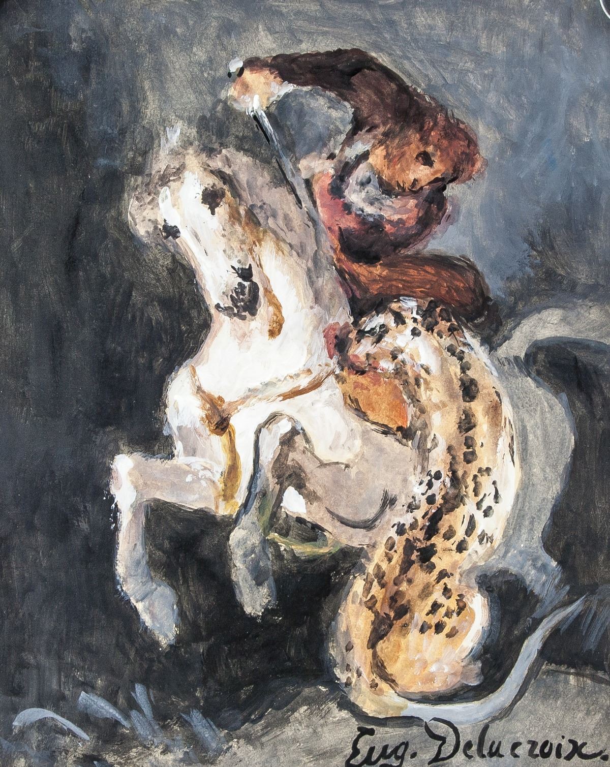 Tempera on paper, French Romanticism School, featuring man fighting leopard, signed Eug Delacroix possible signature of Eugene Delacroix on the lower right corner, inscribed 62 and stamped on verso, 25 x 20 cm (9.8 x 7.9 inches). PROVENANCE: Private American estate.