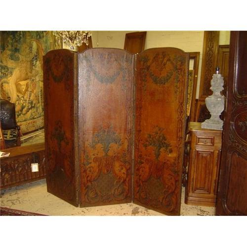 This is a beautiful 2 sided, 2 panel leather screen from France. One side is flat and consists of paint on leather, while the other side is embossed paint on leather. The flat sides are classical Louis XVI decor with garlands of flowers, central bouquets of flowers, cartouches, c and s scrolls, acanthus leaves, and womens faces.