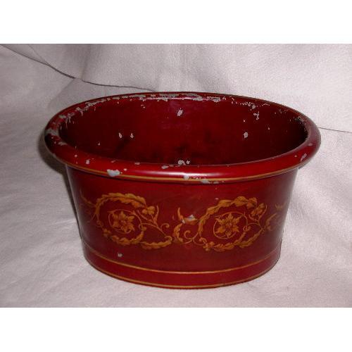 Deep red oval metal jardiniere C.1870 from France has gold tole design across the face on either side. Large size for holding one large plant or two smaller for table or buffet. Stunning with dried arrangement. The metal in excellent condition,no rust as well as the tole design. Small bits of the red paint chipped at the neck as seen in photos. Measures 16L X 10H X 12W.