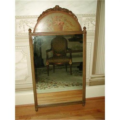 Unusual walnut and antique deep sage green tole mirror from France C.1875-85. Walnut carved floral with tied ribbon arched header above the hand painted tole basket with floral spray in various tones. The grooved turned side columns are walnut and dark sage green. Block corners with rosette and pineapple finial on each which allows for the mirror to set on a chest or hang above. Mid size wood beading adds additional accent. Original mirror in excellent condition as in completely encased in heavy wood back which has protected through the years. Wire hanger on the back. Couple of tiny scuffs of wear to frame which is only minor loss of the green in these aeas. 46H X 24L X 1.5D.