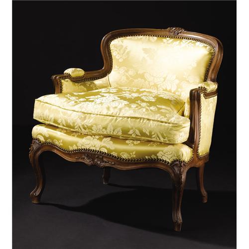 <B>A French Upholstered Low-Back Chair</B></I><BR><BR>Unknown maker, French<BR>Early Twentieth Century<BR>Walnut<BR>Unmarked<BR>29.25 inches high<BR><BR>With a gracefully shaped back and crest rail, chair rail and knees adorned with delicate floral motif, with finger carved arms and cabriole legs; upholstered with gold floral damask.<BR><BR> <B>Condition Report:</B> Some losses to wood.<BR><BR><b>Shipping:</b> Requires 3rd Party Shipping (<a target="_blank" href="http://www.heritageauctions.com/common/shipping.php">view shipping information</a>)