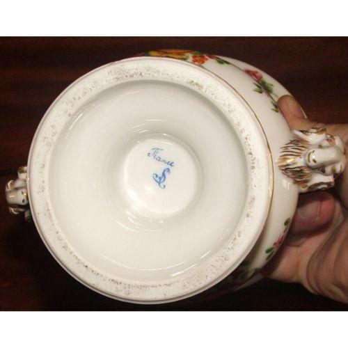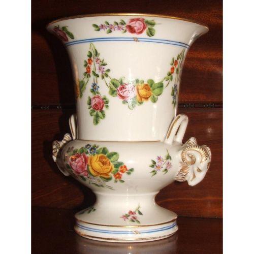 French. An urn with a white background with a floral design and ram's head handles. 7" high.