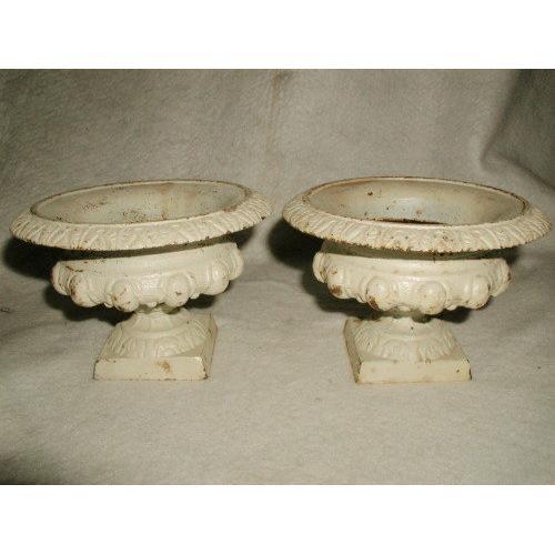 Pair of short French 19th century antique white garden urns of cast iron. Decorative trim around the lp,bowl and square base. Original paint with wear from age as seen. Although cast iron,no visible lines of molding in any area as the quality older pieces stand out against newer ones. Drainage hole in the bottom of each. Wonderful for interior or exterior use. Measure 4.5H X 6.5L X 6.5D.