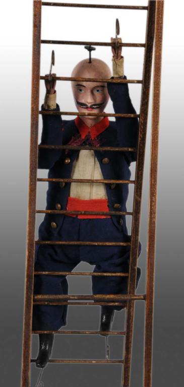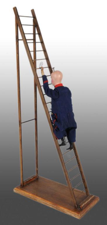 Description Circa late 19th century. Clockwork working. Wooden base and two sections of ladder each approximately 27" L. Original clothing on male figure with a composition face. When wound figure climbs up ladder. Some staining on shirt and wear to mustache. Condition (Excellent). Size 13" L. Base: 12" x 6".