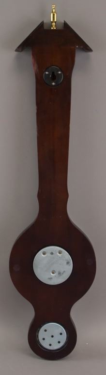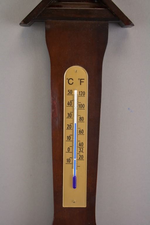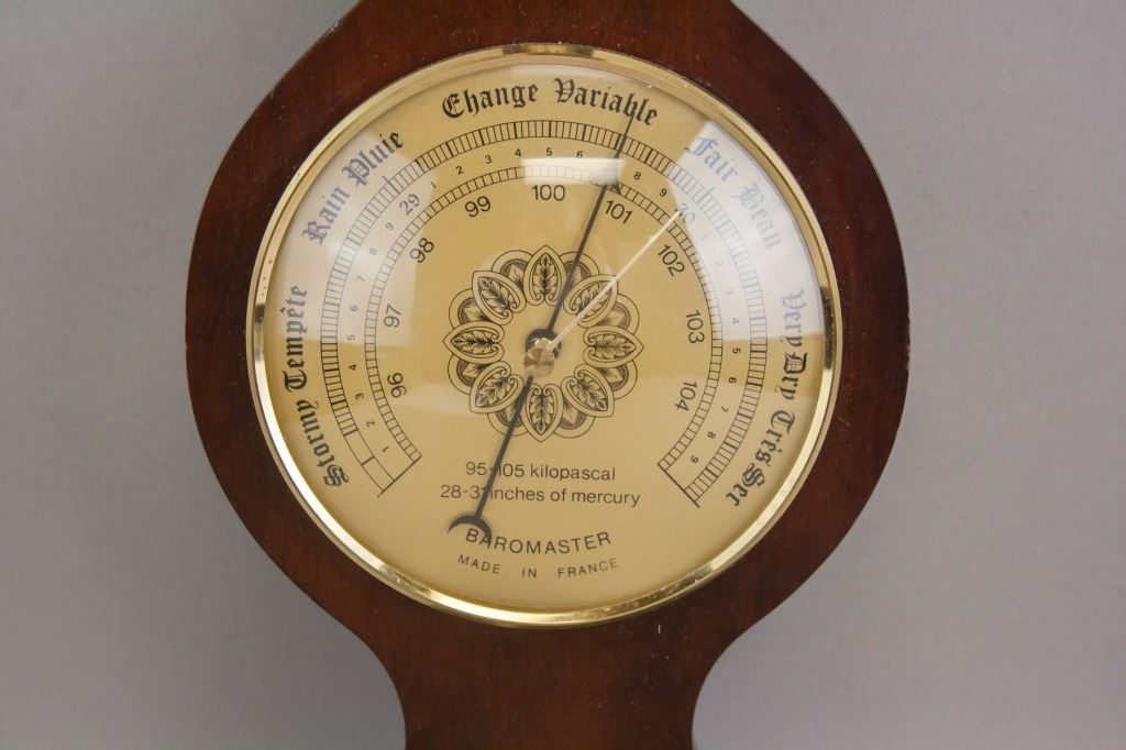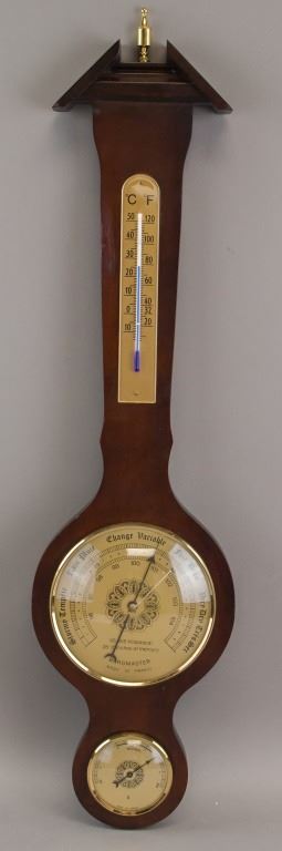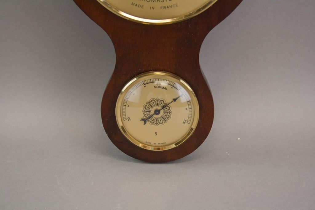 Wooden hanging barometer. Of deep brown tone with glass encased faces. Measures temperature, air pressure, and humidity. Made in France. Unsure if in working condition. 64 x 17 cm. 786 grams.