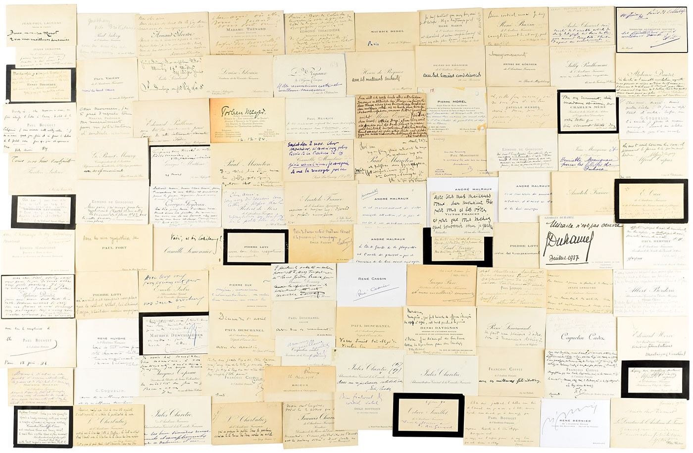 Collection of over 100 visiting cards, mostly from members of the Academie Francaise: a few are signed, and most bear some kind of note, greeting, or handwritten sentiment; a few have no handwriting, or annotations in other hands. Includes: Rene Bazin (2), Maurice Bedel, Rene Bernier, Georges Berr, Henry Bordeaux, Albert Borderie, Paul Bourget (3), Emile Boutroux, Eugene Brieux, Alfred Capus (2), Emile Caro, Rene Cassin, Francis Charmes, Victor Cherbuliez (2), Jules Claretie (3), Jacques Copeau, Francois Coppee (3), Coquelin cadet (2), C. Coquelin (2), Countess Cunliffe-Owen, Alphonse Daudet (2), Madame Alphonse Daudet, Henri Davignon, Paul Deschanel (3), Maurice Desvallieres, Maurice Donnay (2), Georges Duhamel, Pierre Dux, Emile Fabre, Emile Faguet, Paul Ferrier, Octave Feuillet, Georges Feydeau, Robert de Flers, Paul Fort, Anatole France (2), Victor Francen, Edmond de Goncourt (2), Edmond Haraucourt, Edouard Herve, Paul Hervieu, Rene Huyghe, Fantin Latour, Jean-Paul Laurens, Georges Lecomte, Paul Legrand, Jules Lemaitre (2), Camille Lemonnier, Rene Lenormande, Pierre Loti (3), Andre Malraux (4), Paul Margueritte, Paul Marieton (2), June Marignan, Georges Mathias, Camille Mauclair, G. Gonet Maury, Catulle Mendes, Charles Mere, Paul Meurice, Torben Meyer, Pierre Morel, Edouard Pailleron, Marcel Prevost, Sully Prudhomme, Henri de Regnier (3), L. Rigaux, Louise Silvain, Armand Silvestre, Senta Soneland, Madame Thenard, Andre Theuriet, Edmond Thiaudiere, and Paul Valery (2). In overall fine condition.
