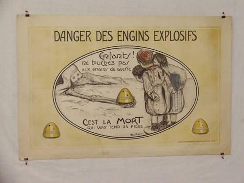 French WWI Poster, "Danger Des Engins Explosifs etc. C'est La Mort etc.", Artist-Miere Rolivier (?), Printer-Imp. J.E. Goossens_Bruxelles – Lille – Paris, 31 1/4" x 47 1/4", Condition – Good: Large 5" Stabilized Tear to Lower Border, Corner and Fold Creasing, Soiling; Linen Backed,