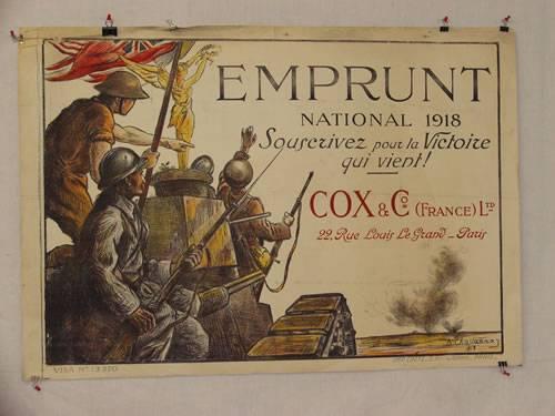 French WWI Poster, "Emprunt National 1918 etc.", Artist-B. Chavannaz-1918, Printer- Imp. Crete_2 Rue Des Italiens-Paris/W.W. White and Co., Mounters-Boston, 30 3/4" x 44 1/2", Condition – Poor/Fair: Large Breakaway Tear to Upper Left Corner, Other Border Tears, Creasing and Soiling, Square Shadow Stain in Center; Linen Backed w/ Holes for Grommets,