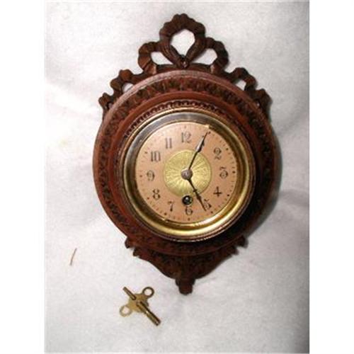 Beautiful French C.1850 wall clock hand carved of thick walnut with flowing bow at center top. Brass casing and glass door with tiny beading surrounds the brass collar and painted tan face with black roman numerals and French hands. Original all brass movement.Hand adjustment done with bushing on back inside back plate. New key winds the 30 hour clock in front. Hanger at top on back. Works wonderfully,professionaly adjusted,excellent condition. Measures 12H X 7.5L X 4.5D.