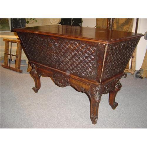 This walnut wood petrin was probably built in the 1940's. It has a fleur de lys pattern on the sides, with Louis XV styling, as evidenced by the shells. These petrins were used as dough bins. It is in excellent condition!