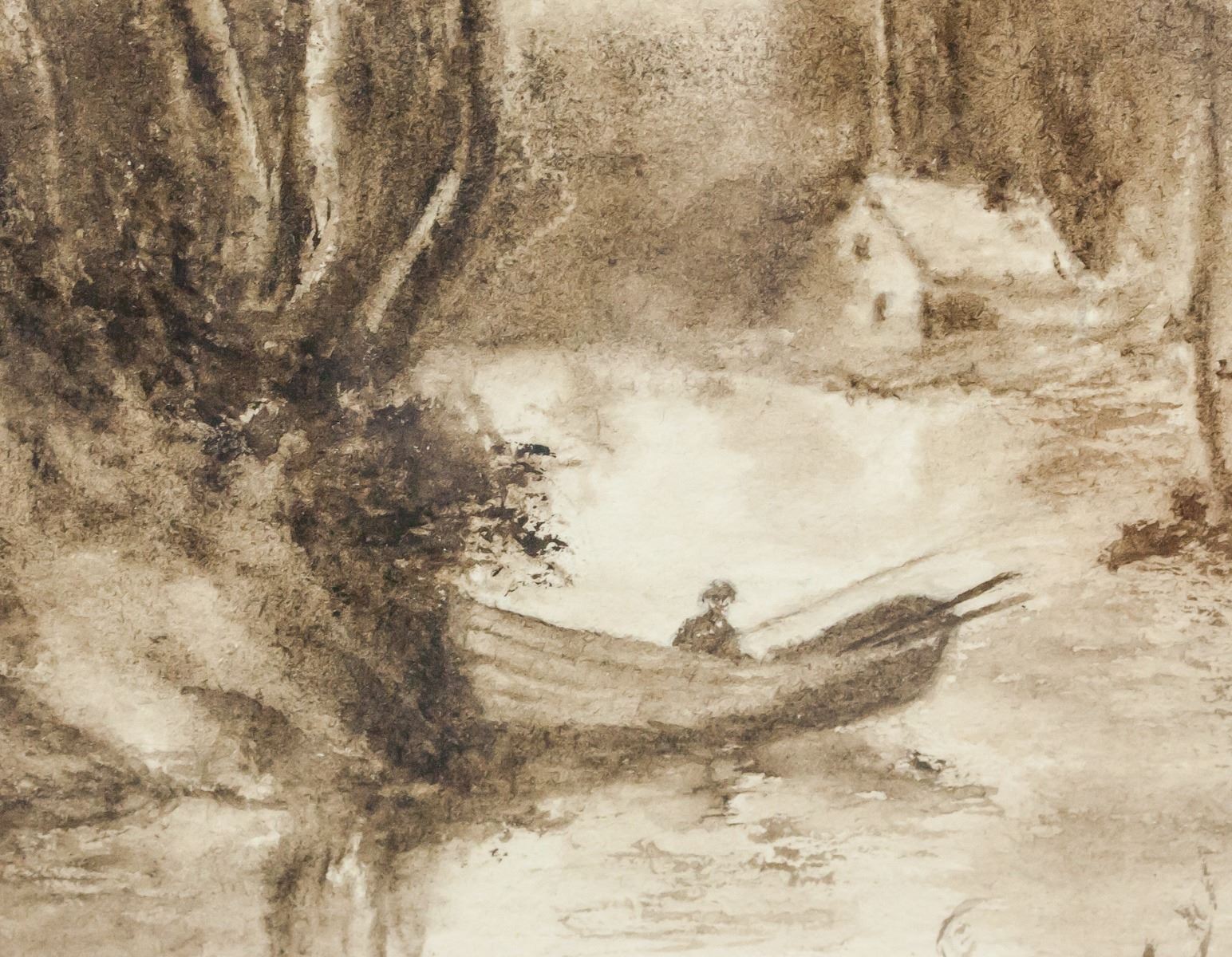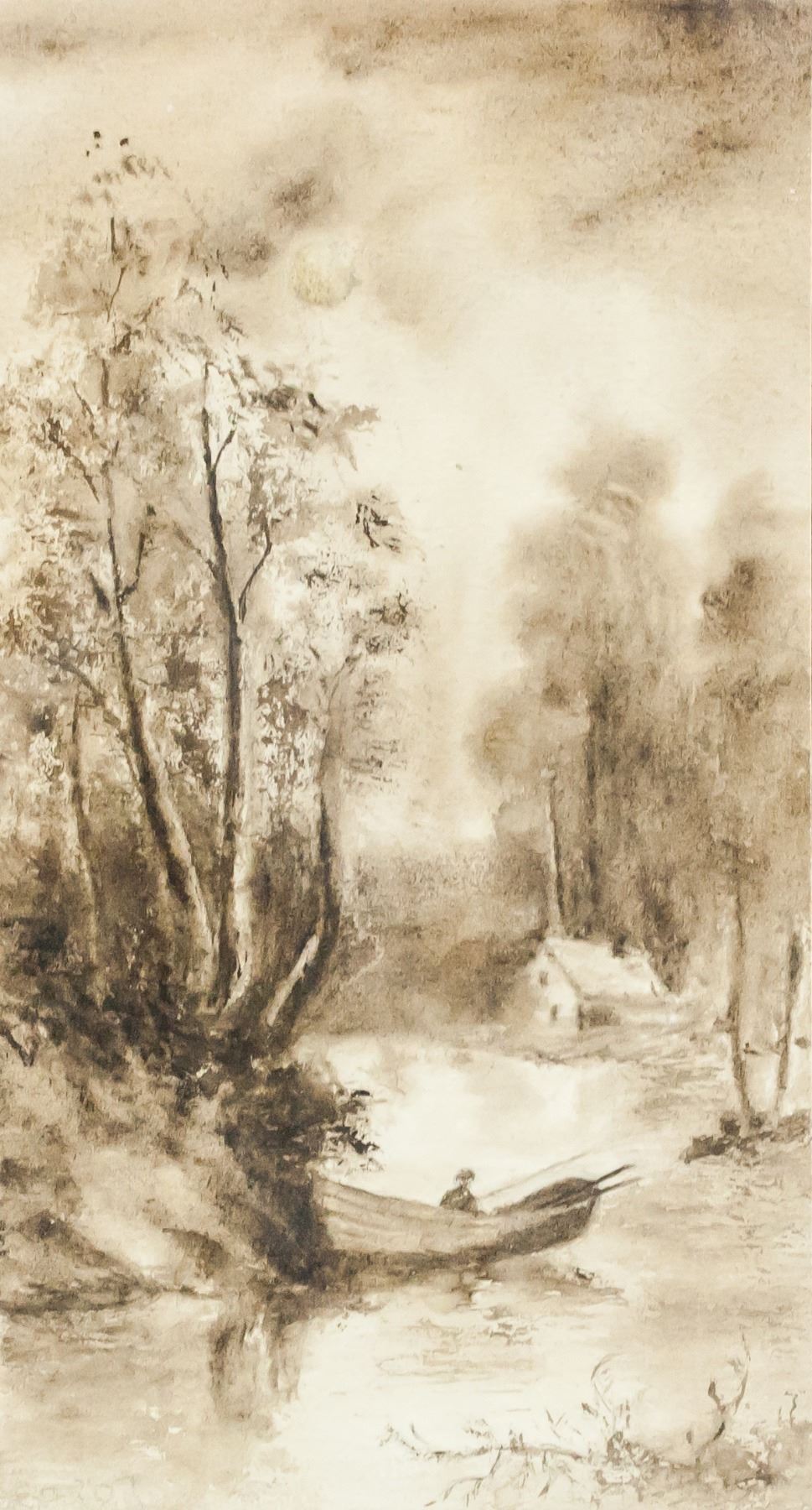 Watercolor on paper, framed. Featuring forest scene. Lower left corner signed. 18.5 x 10 cm Frame: 30.5 x 22 cm