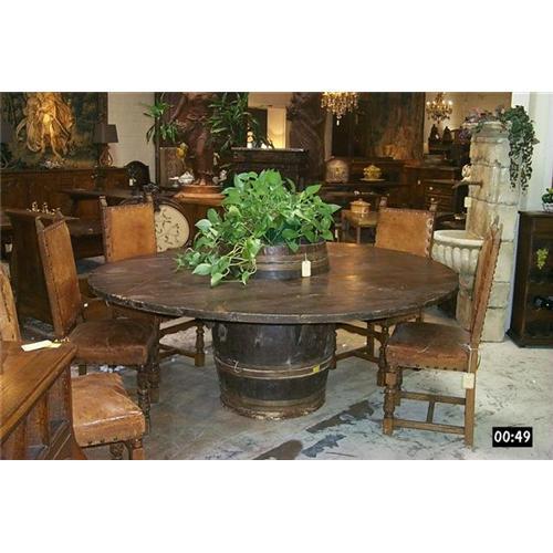 We bought this wine table in the Rouen area of France. We thought it would be a nice addition to the wine section of our showroom. The round top sits on an old wine keg barrel, and makes a great wine table for those who have more room and want to seat more people. The diameter is 78 inches. Only one remains.