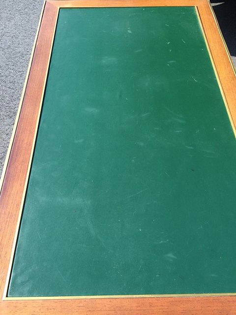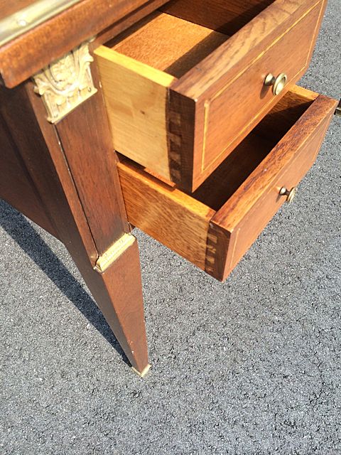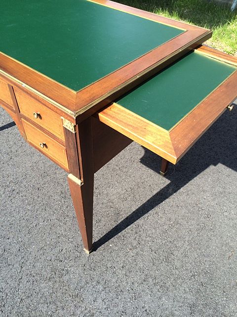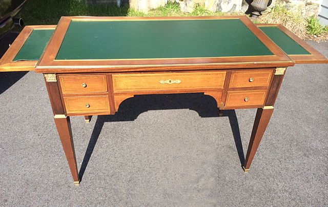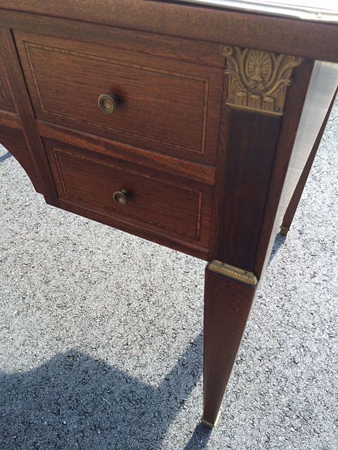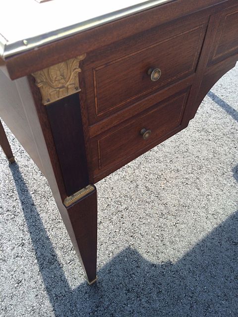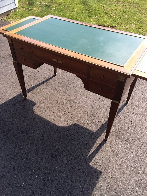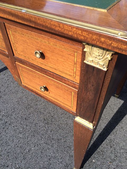 French Writing Desk with green leather top, pull outs on either side with bronze decorative mounts. Measures approx. 26" deep x 44" long x 30" tall.