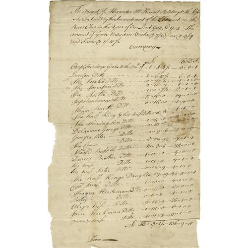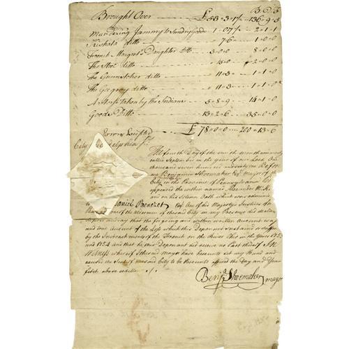 <B>(French and Indian War) Manuscript Document, two pages, 7.5" x 12", Philadelphia, September 9, 1761, with a lengthy endorsement signed by Philadelphia Mayor Benjamin Shoemaker approving a series of claims filed by Alexander McKermet.</B></I> "<I>...Relating to the Losses he sustain'd [sic] by the Incroachment [sic] of the French on the river Ohio in the Year of our Lord 1753 & 1754...</B></I>" The document lists the claims which are primarily listed by individuals, many of whom appear to be Indians including "<I>...Tassalauhervau...The Half King & his Wife...Delaware George...The Crow...The Half Kings Daughter...</B></I>" Other names include "...Capt. Jacob... Thames Hickman... John Hickman...French Margaret's Daughter..." McKermet was likely an English fur trader who was forced out of the upper Ohio Valley when a French expedition moved into the region to assert France's control over the area -- thus touching off the Seven Years (French and Indian) War. Judging from the names on the list, McKermet lived in a mixed community of English, French and Indians. Also interesting here is the presence of a "<I>Half King</B></I>," an Iroquois representative or diplomat who asserted the Confederation's authority in the Ohio Valley. The total losses amounted to £78-0-0. Mayor Shoemaker of Philadelphia signs at the bottom of the second page attesting to the accuracy of the account. Chipping to margins with the loss of a few words of text, usual folds, otherwise very good condition. From the Henry E. Luhrs Collection.