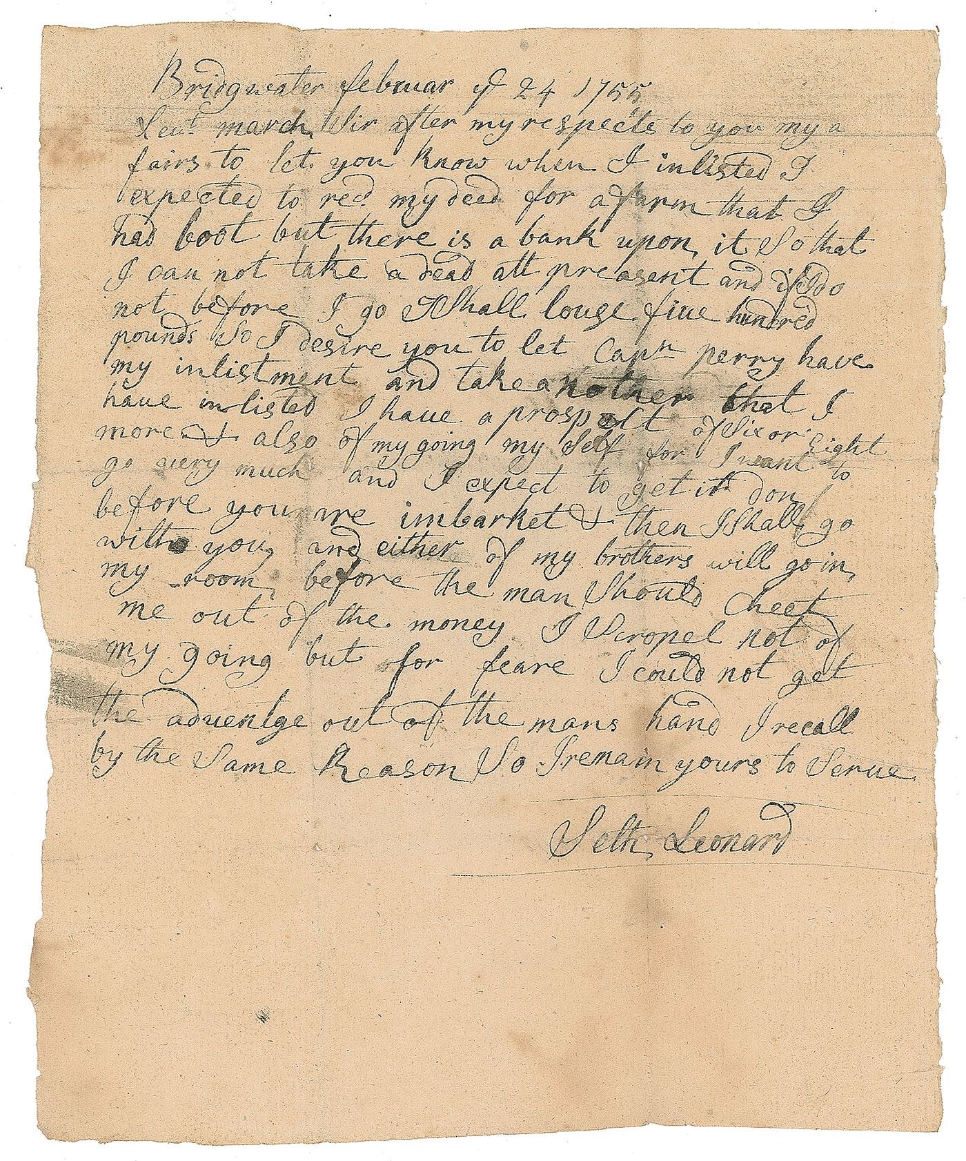 ALS signed “Seth Leonard,” one page, 6 x 7.5, February 24, 1755. Written during the height of the French and Indian War, in full (spelling and grammar retained): “Leut. march Sir after my respects to you my a fairs to let you know when I inlisted I expected to recd my deed for a farm that I had boot but there is a bank upon it So that I can not take a deed att preasent and if I do not before I go I shall louse five hundred pounds So I desire you to let Capn Perry have my inlistment and take another that I have inlisted. I have a prospect of Six or Eight more & also of my going my Self for I want to go very much and I expect to get it don before you are imbarket & then I shall go with you and either of my brothers will go in my room before the man Should Cheet me out of the money. I scropel not of my going but for feare I could not get the adventge out of the mans hand I recall by the Same Reason." In very good to fine condition, with light soiling and staining.