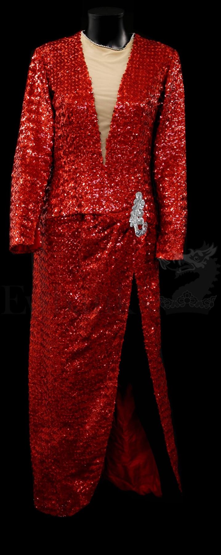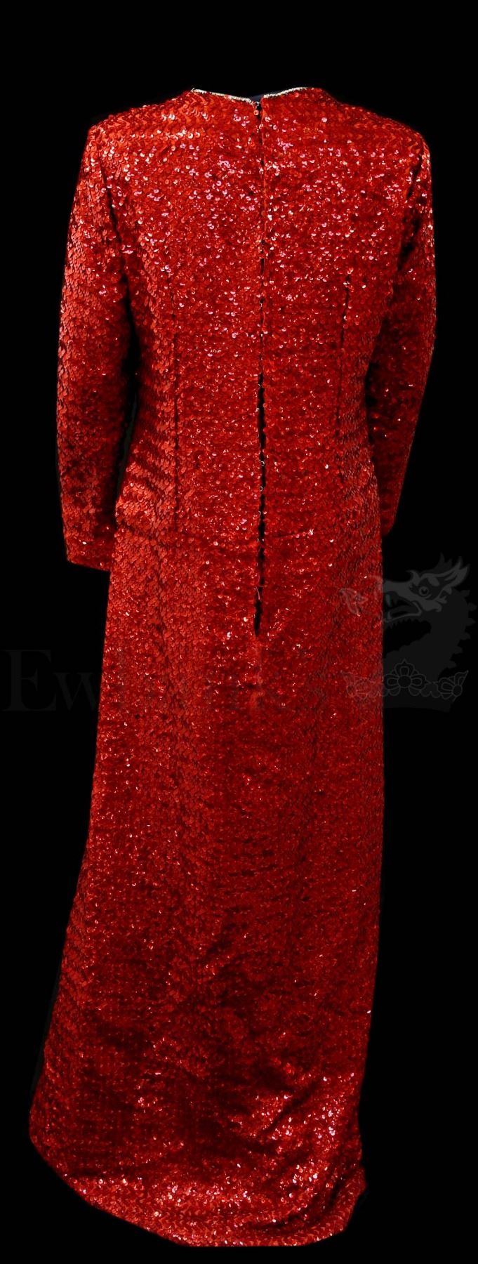 † French and Saunders (1987 - 2017) The costume worn by Jennifer Saunders as Marilyn Monroe in their spoof comedy homage sketch of 'Gentleman Prefer Blondes'. One of the most highly remembered sketches of their career. The floor length gown, covered in red sequins, closely emulates the dress worn by Jane Russell in the classic film. Please note that VAT is payable on top of the hammer price at 20% in addition to standard buyers premium inc. VAT for this lot.