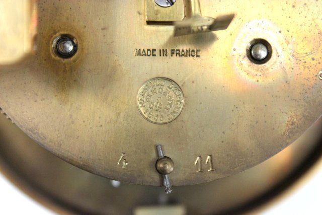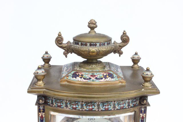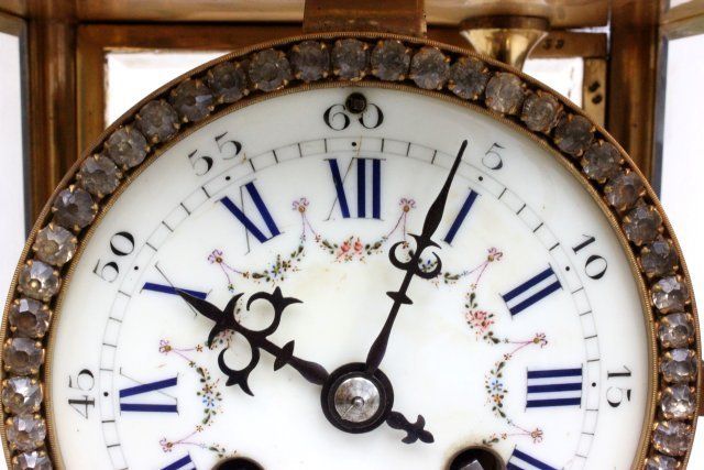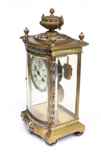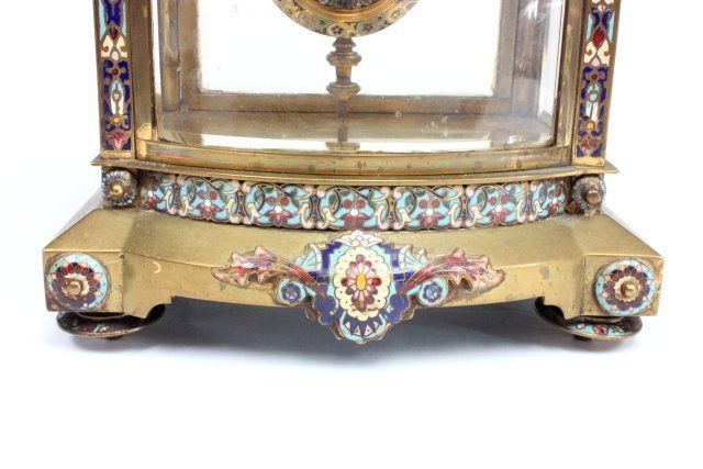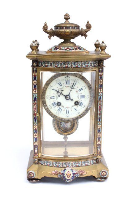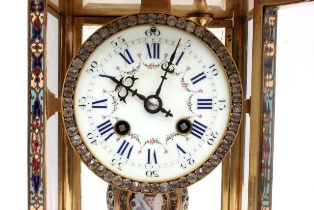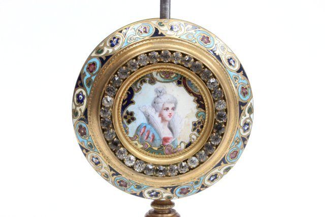 With porcelain face, key & pendulum, portrait & enamel decorated. Approx. 15" x 6.75".