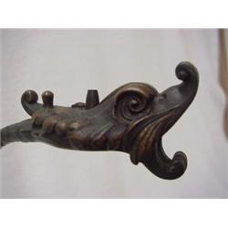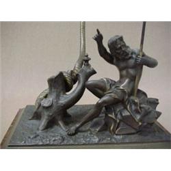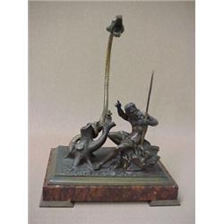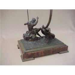 French bronze watch or ball clock holder depicting Moses and the serpent with open mouth, wrapped around tree stump and seated Moses with staff, on rectangular marble base with four brass corners, measures 15" high x 11 1/2" across x 8 3/4" deep, late 19th C